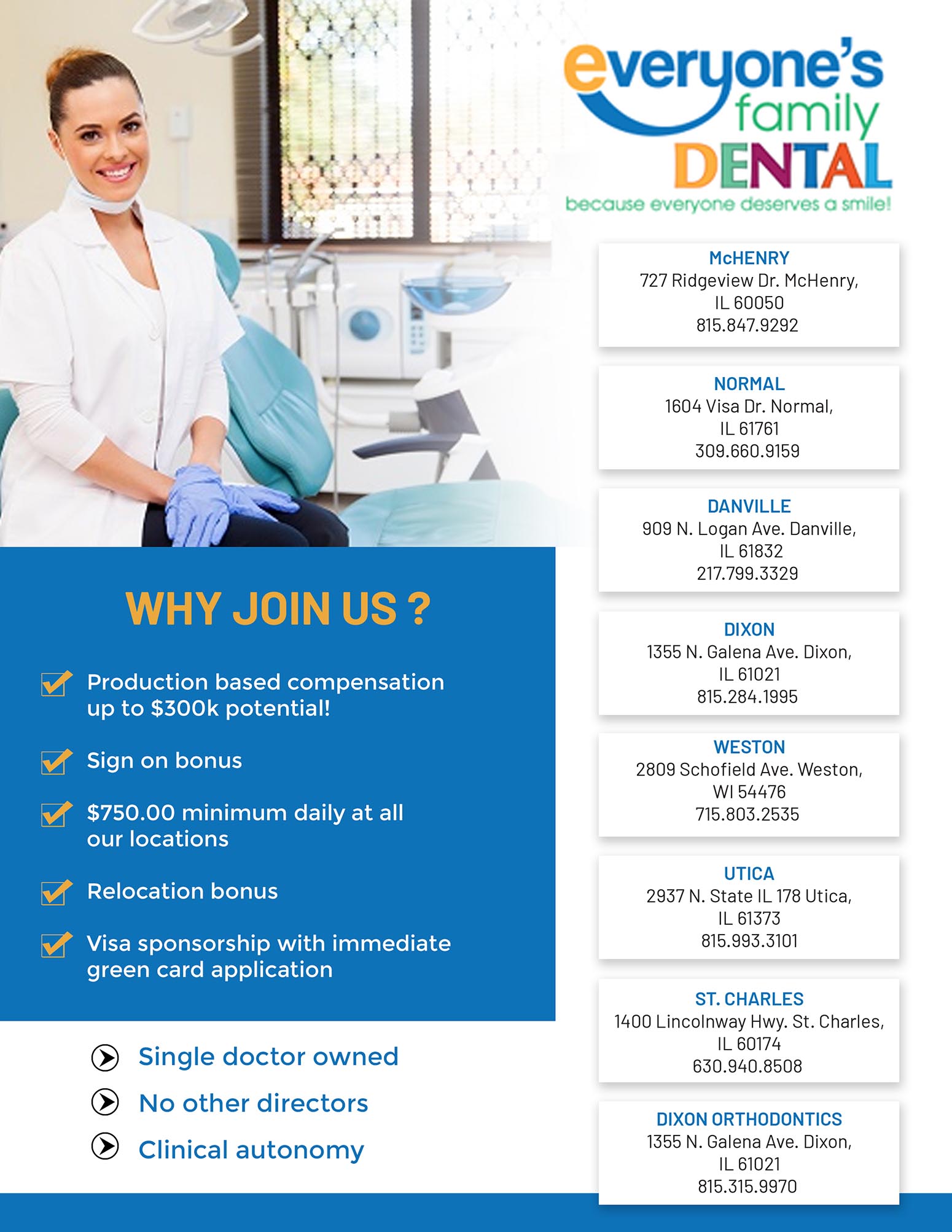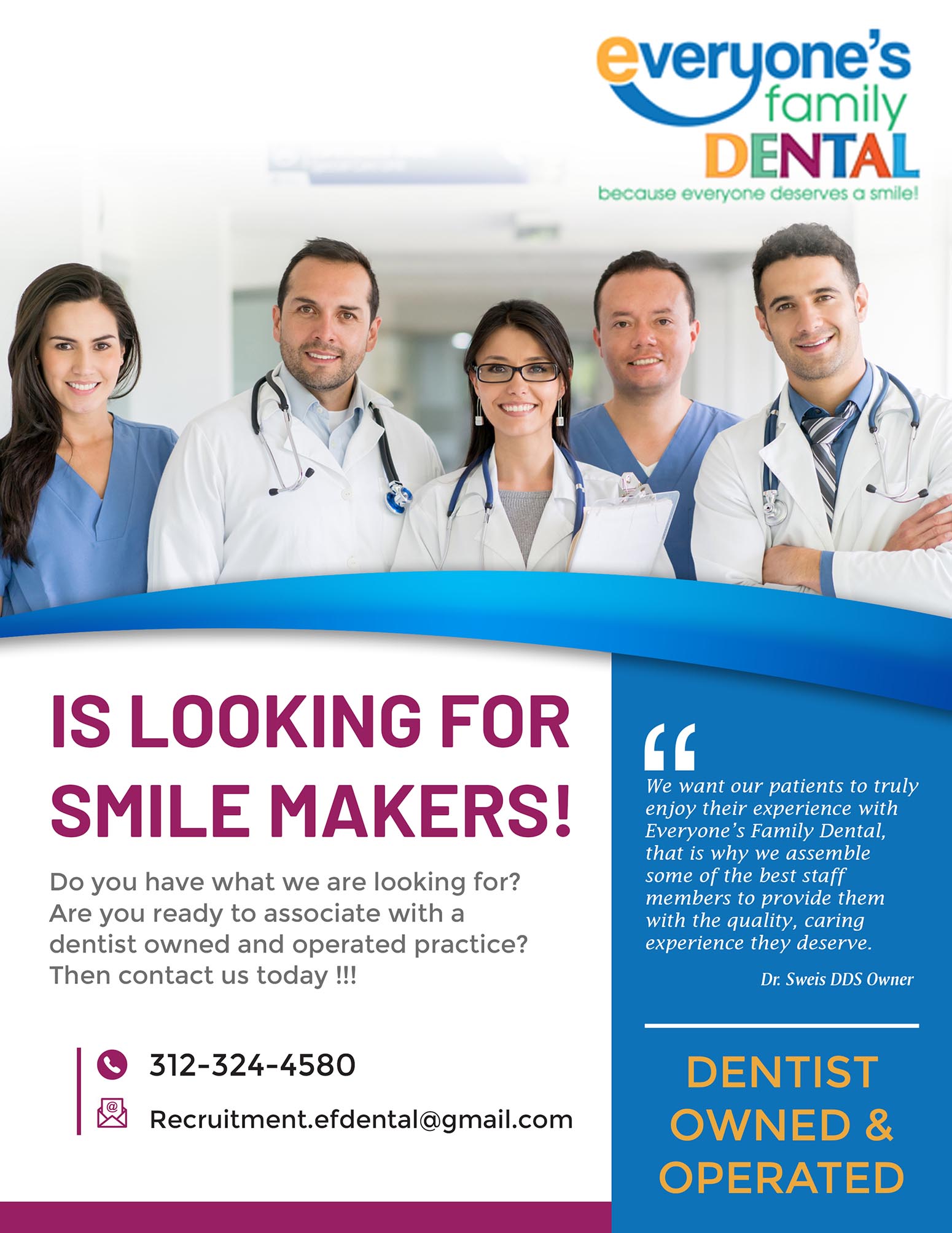 Everyones Family Dental provides excellent career opportunities for motivated individuals with a passion for dentistry. We are always looking for motivated dental professionals to join our team. Please submit your application to recruitment.efdental@gmail.com and mention the job code/job title in the subject line.